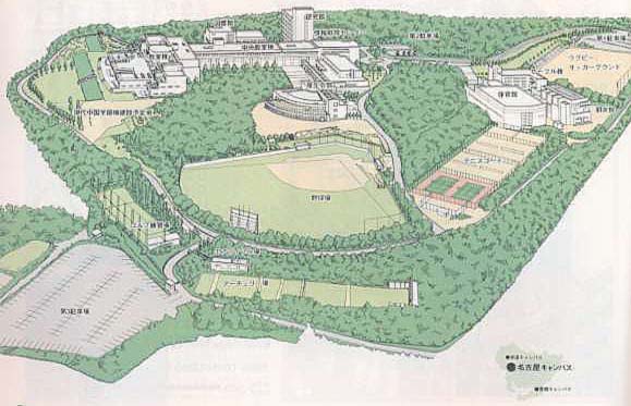 Out of all the university campuses in Nagoya, this is the most convenient. It is about ten minutes by Subway Sakura-dori Line from Nagoya Station to Kurumamichi Station which stands right in front of the campus. It is possible to get there easily from almost any direction. If you enter the South Gate (the usual way in) you find yourself face to face with the campus buildings and their many classrooms.